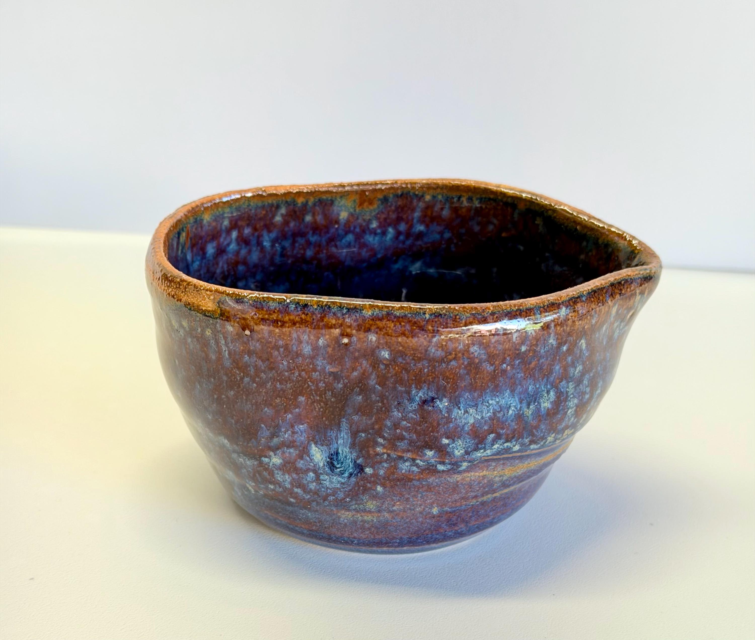 Hand thrown herb stripper with blue and brown glazes on white clay body.