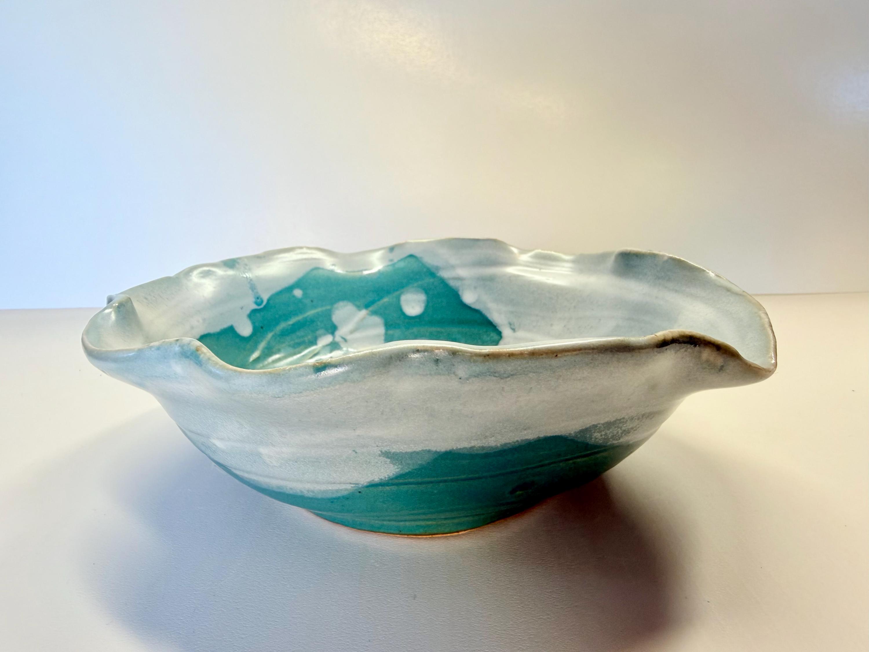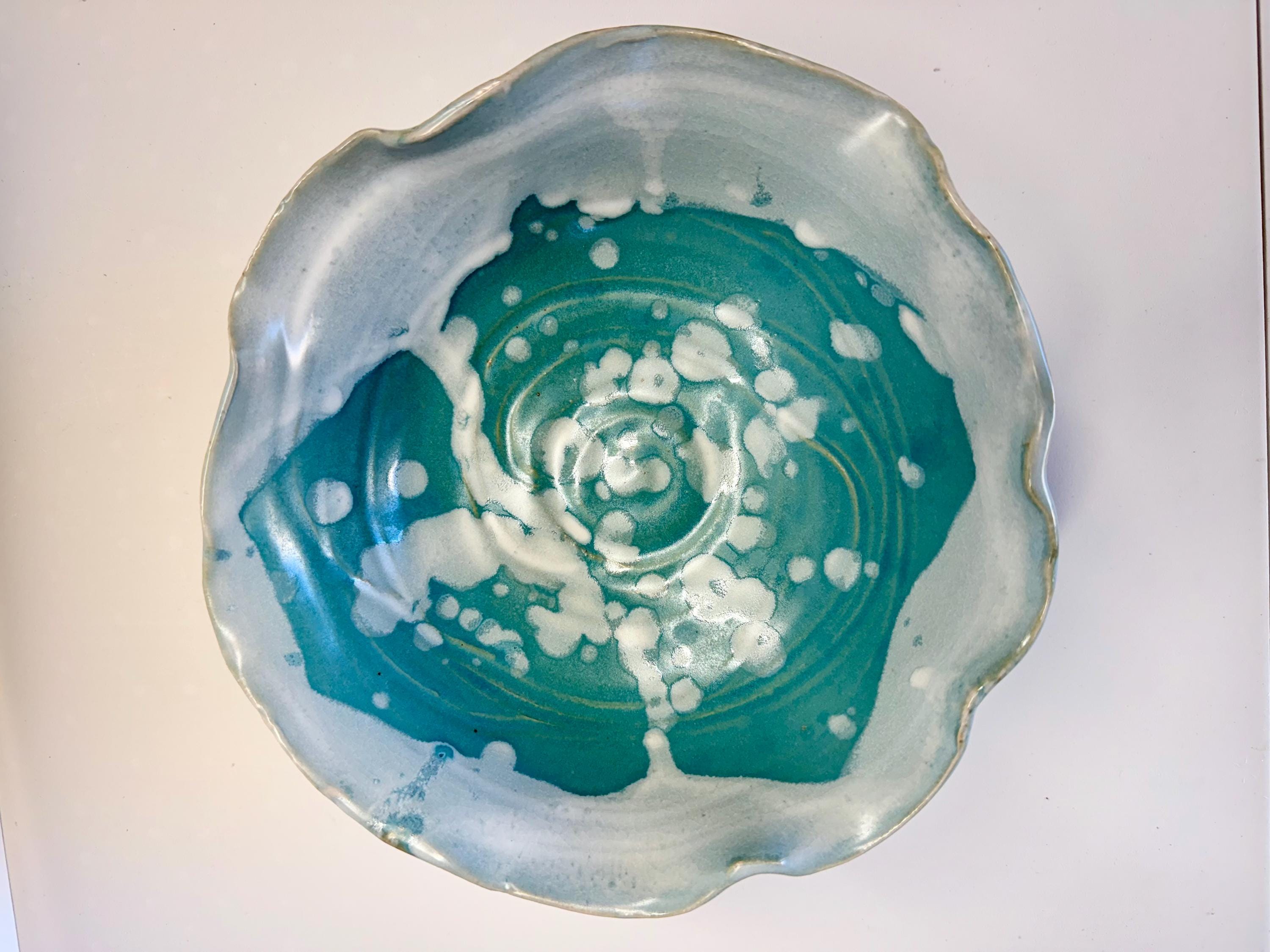 Turquoise and white serving bowl. This color combo reminds me of the ocean with the white foam coming to shore. This bowl can be used for single servings or as a container for keys/jewelry/misc. Or, it can also be used to serve at a party or function where you need something for dip/crackers/small salad.