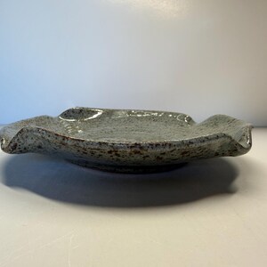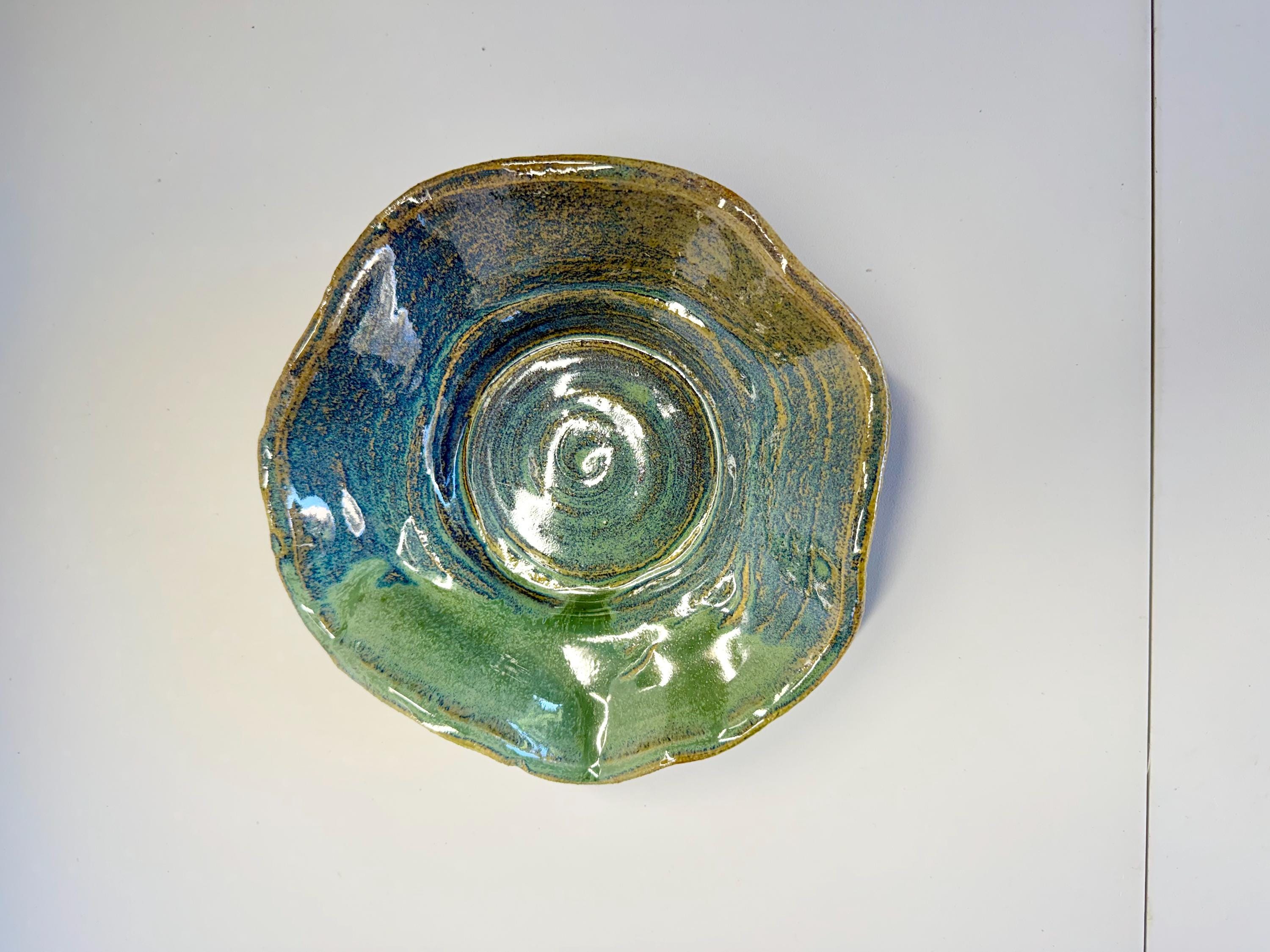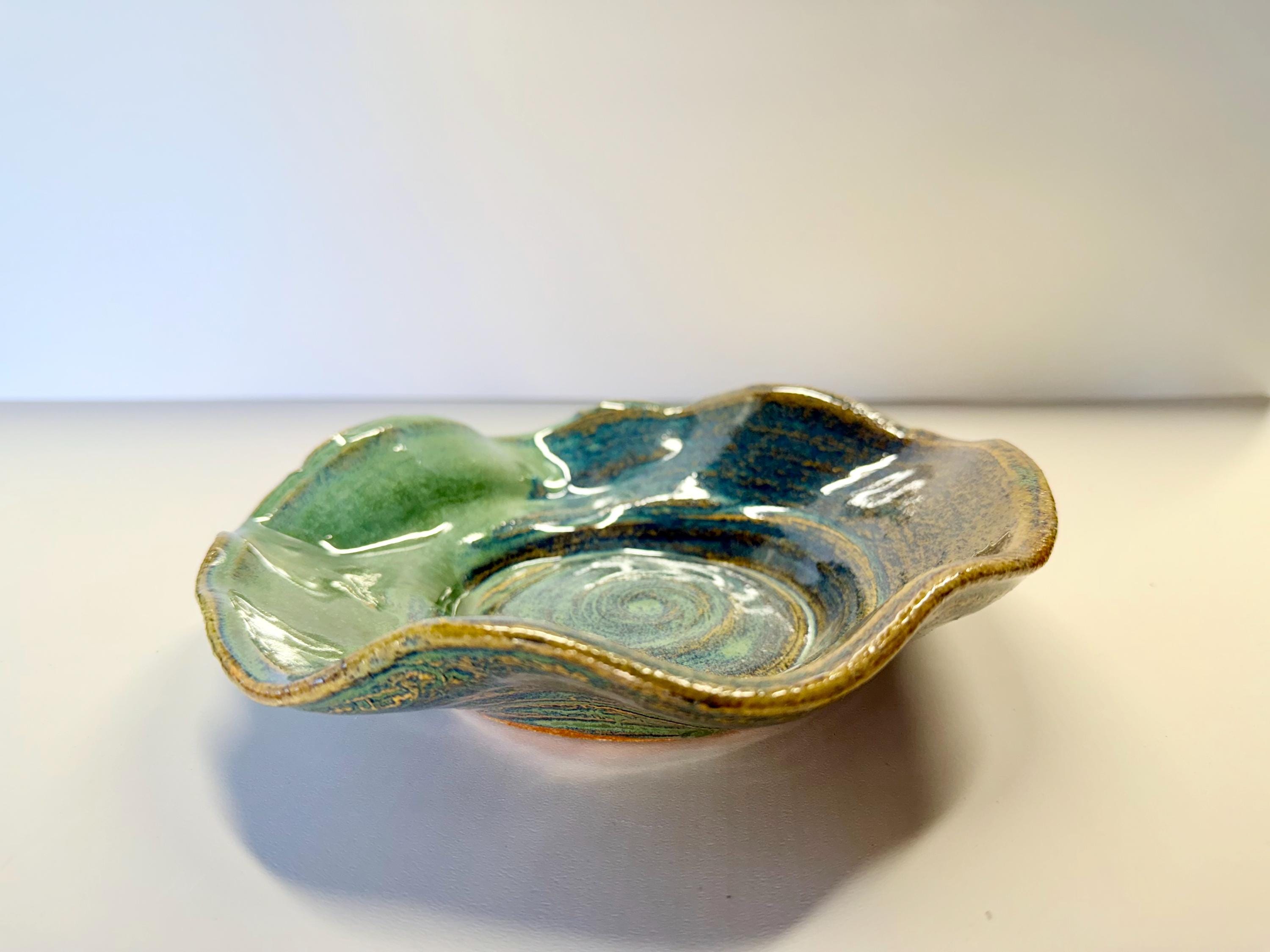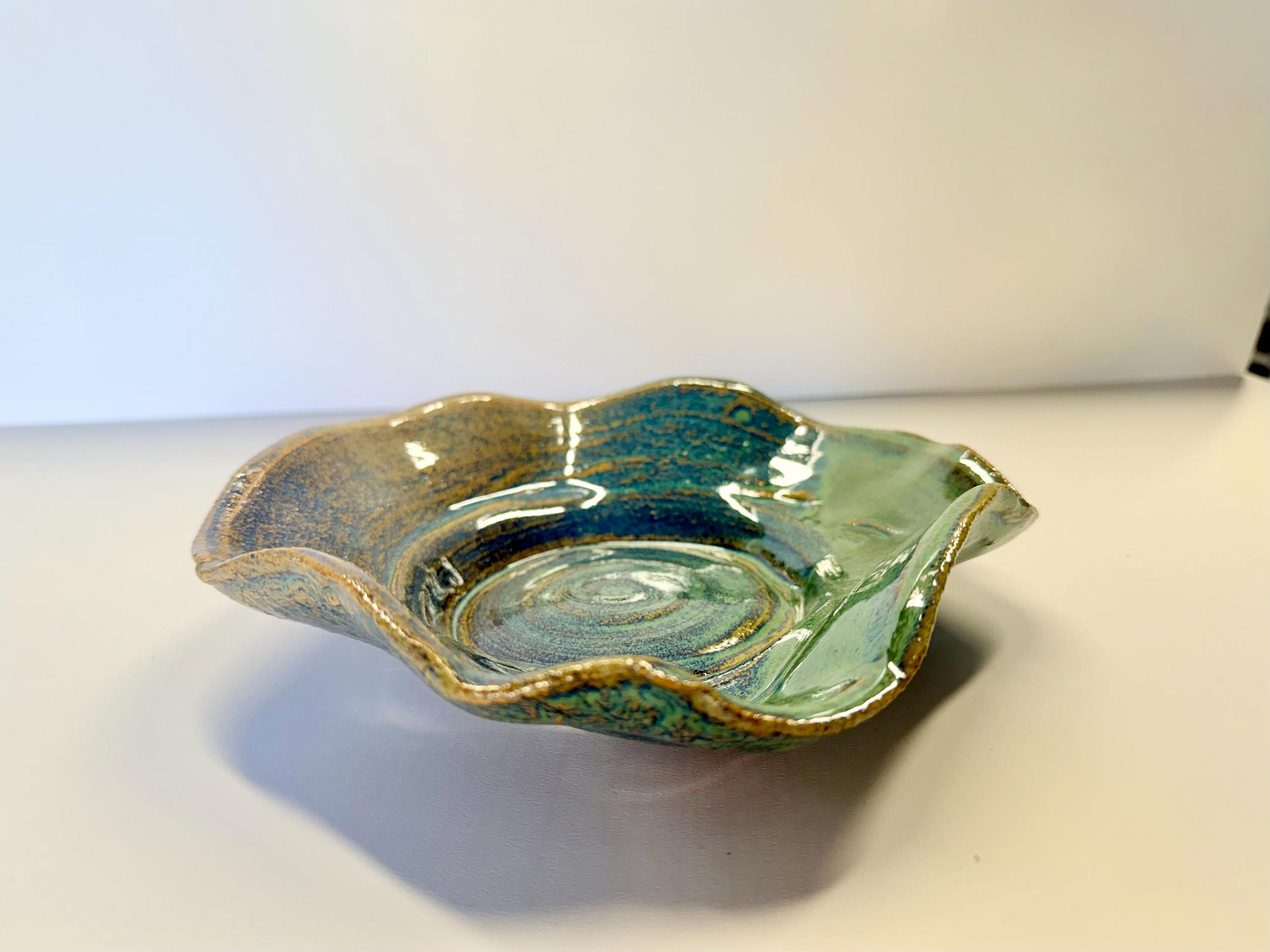 This is a small platter with wavy edge for serving crackers/dips etc. Or, an individual snack plate. It can also be used as a "catch-all" dish for keys/jewelry/fruit/vegetables. The glaze is a green over brown with lots of cool breaks in the design.