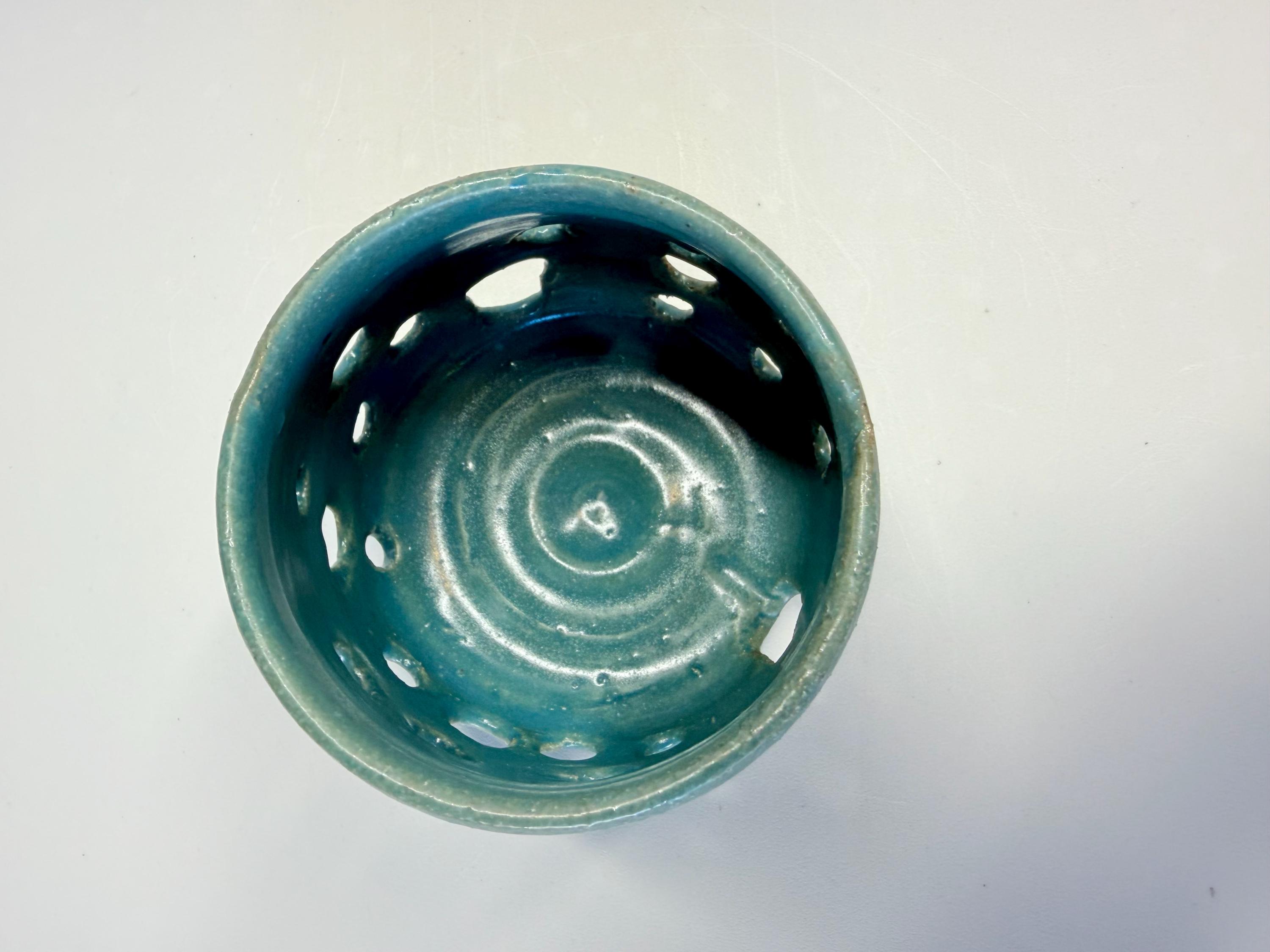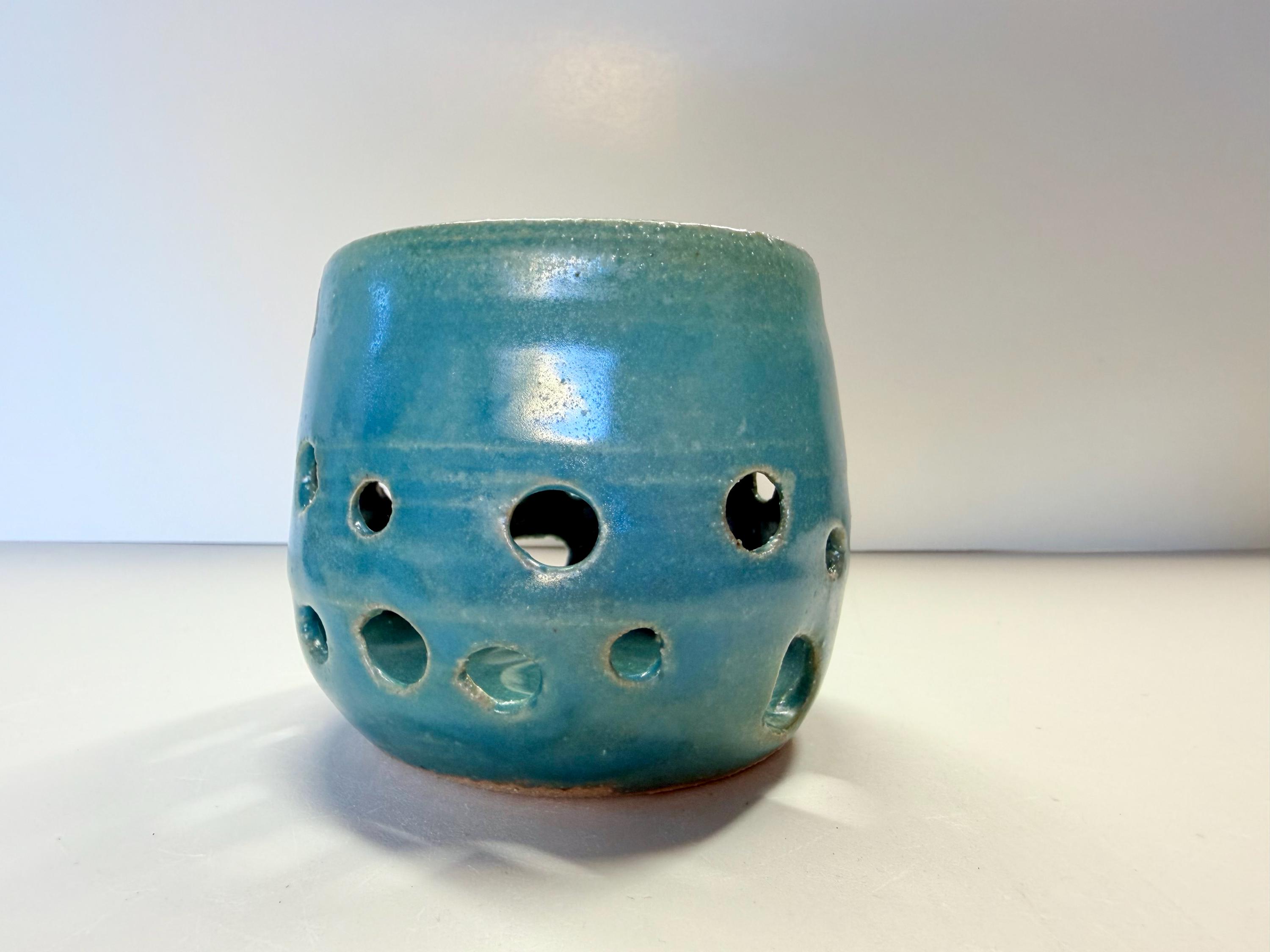 Candleholder or incense holder ..it's up to you for this multi-tasking item. The glaze is turquoise over a white clay. It's a bohemian coastal look. And, the multiple holes allow filtered light. And, as with all my pottery, it's one of a kind. So, if you like it, order it! This listing is for a set of 2 however, they can be purchased separately. The smaller one is $20 and the slightly larger one is $25.