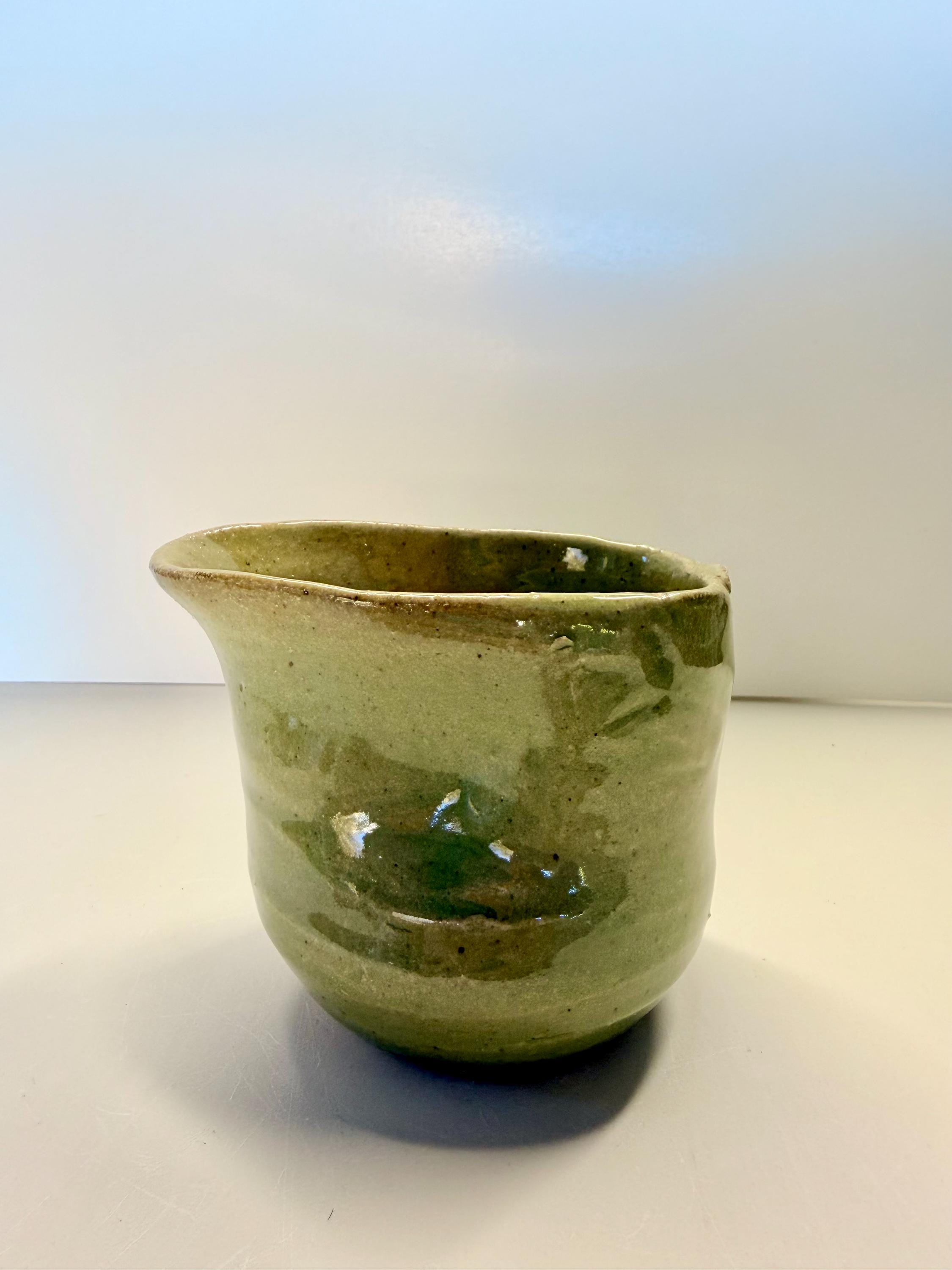 This pitcher has indentations on sides for easy pick up and use. It is a khaki color..so neutral for most kitchen decor. I would use it as a creamer or for any sauce you wanted to have on the table. And, as with all my pottery, it is one of a kind. I can make others, but i can't guarantee how the glaze and clay will play together.