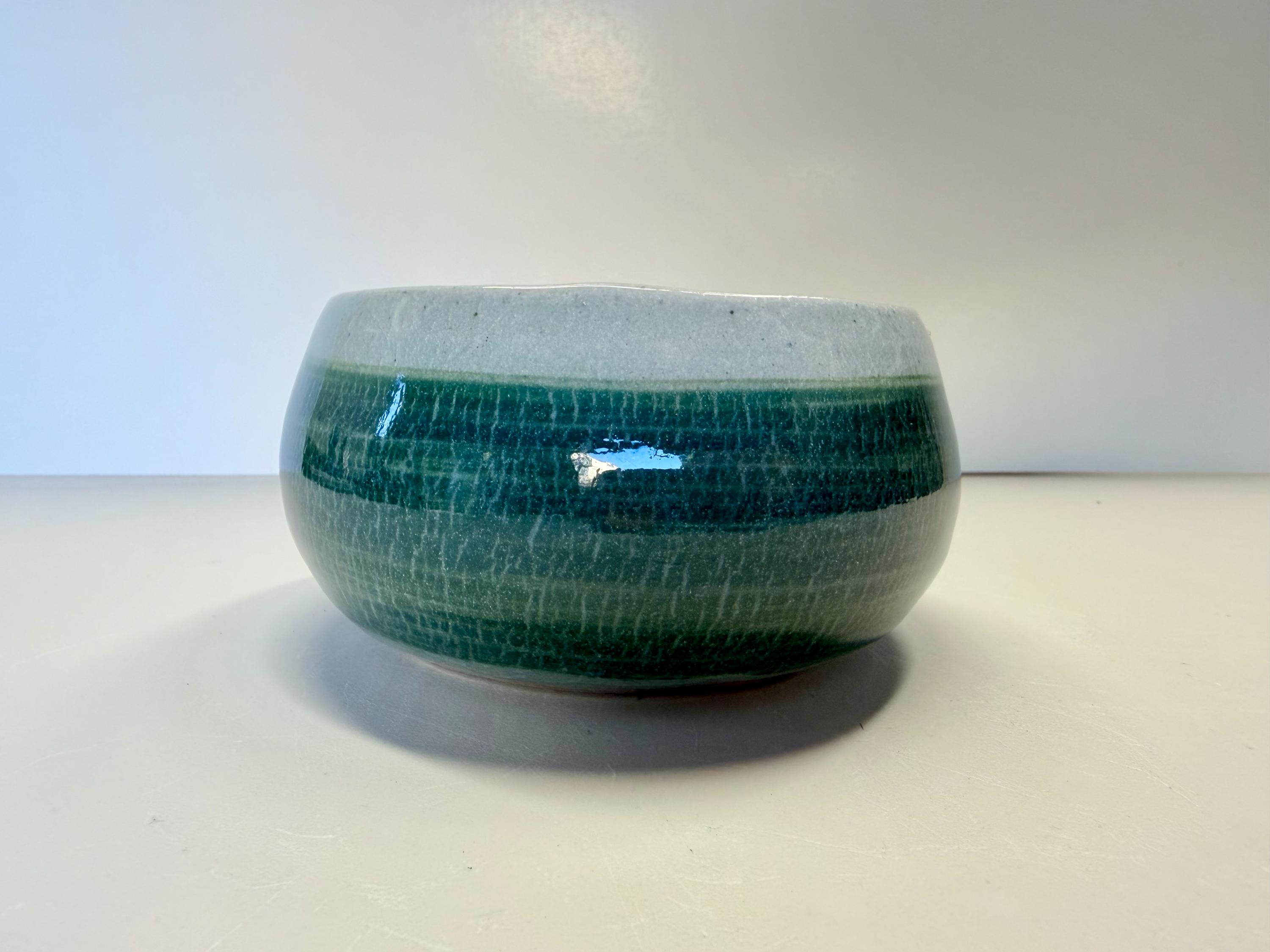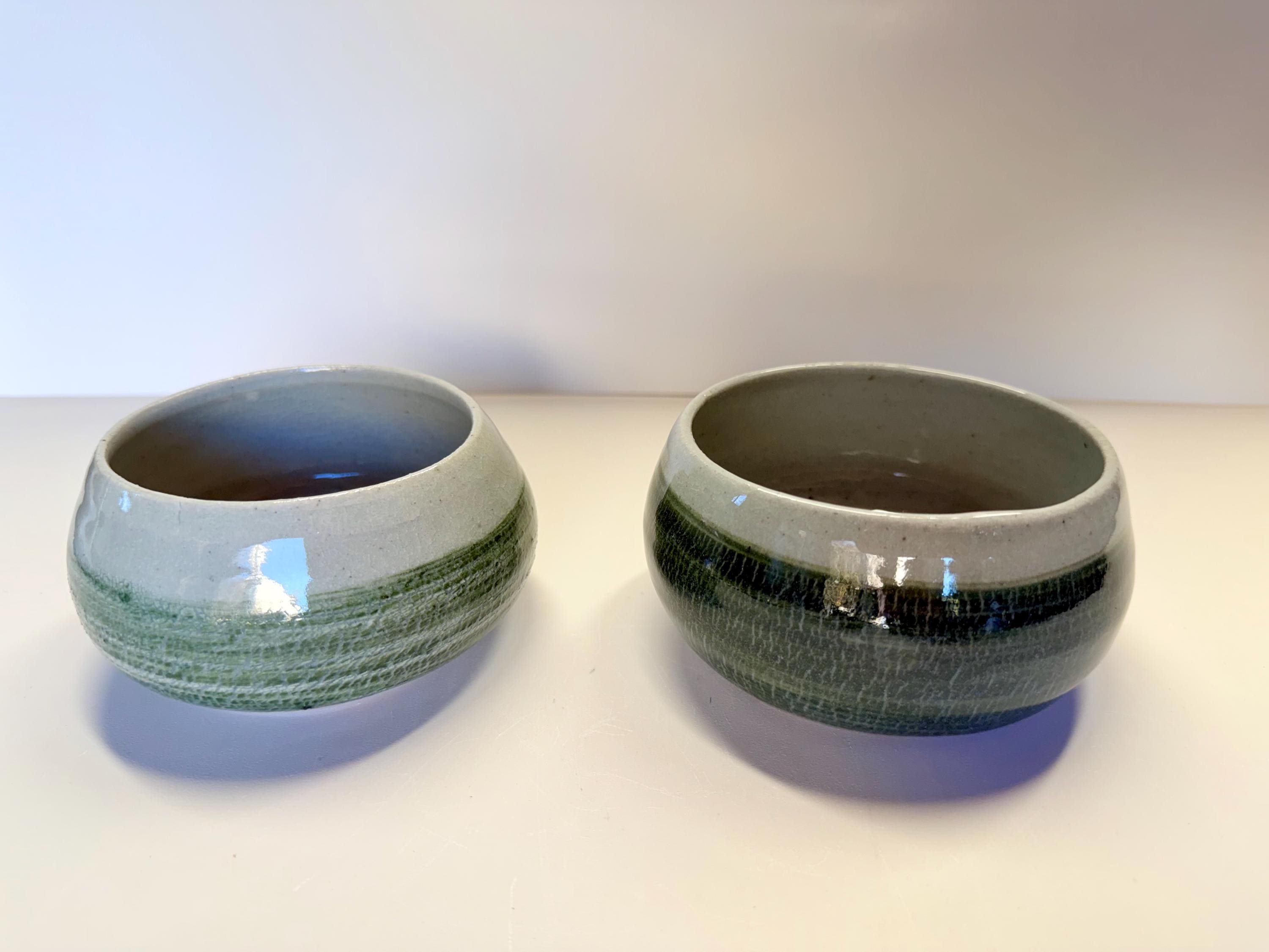 Set of 2 bowls with turquoise crackle bands. These can be sold as a set or the smaller is $25 and the larger one is $35. These could be used for sauces and dips with chips/crackers or as a "catch-all" dish for jewelry or keys or whatever ends up on your counters. The glaze is great for Spring and Summer..gives off a very coastal vibe. It is a white overall iwth a turquoise band. I used sodium silicate to create the "crackle effect". They are thrown using a B-mix clay with sand - cone 10. As with all my pottery, these are one of a kind, so if you like them, order them. I can make more, but i can't guarantee how the glaze and silicate with play with the pottery each time they meet.