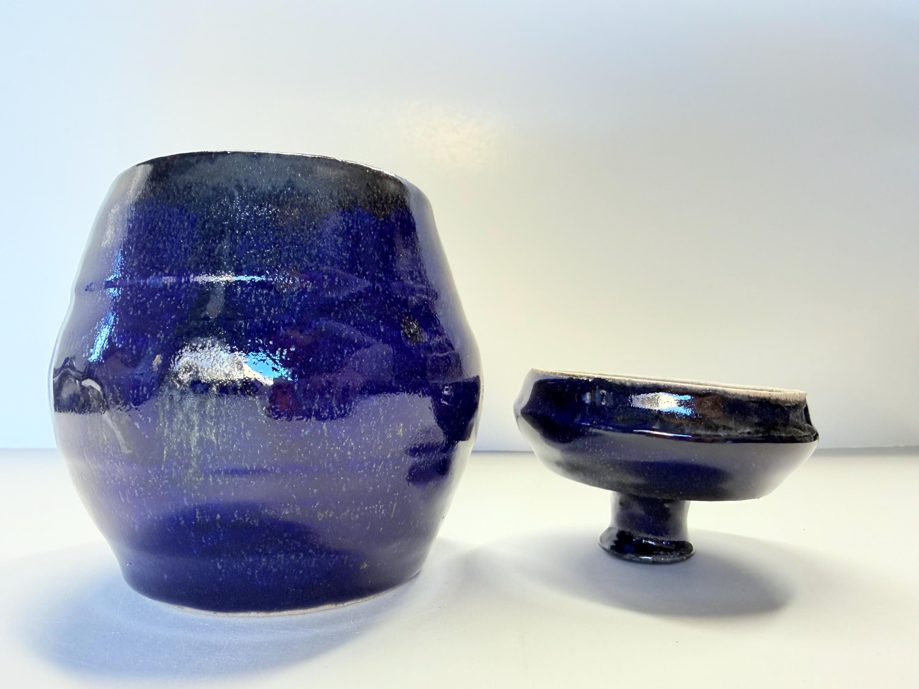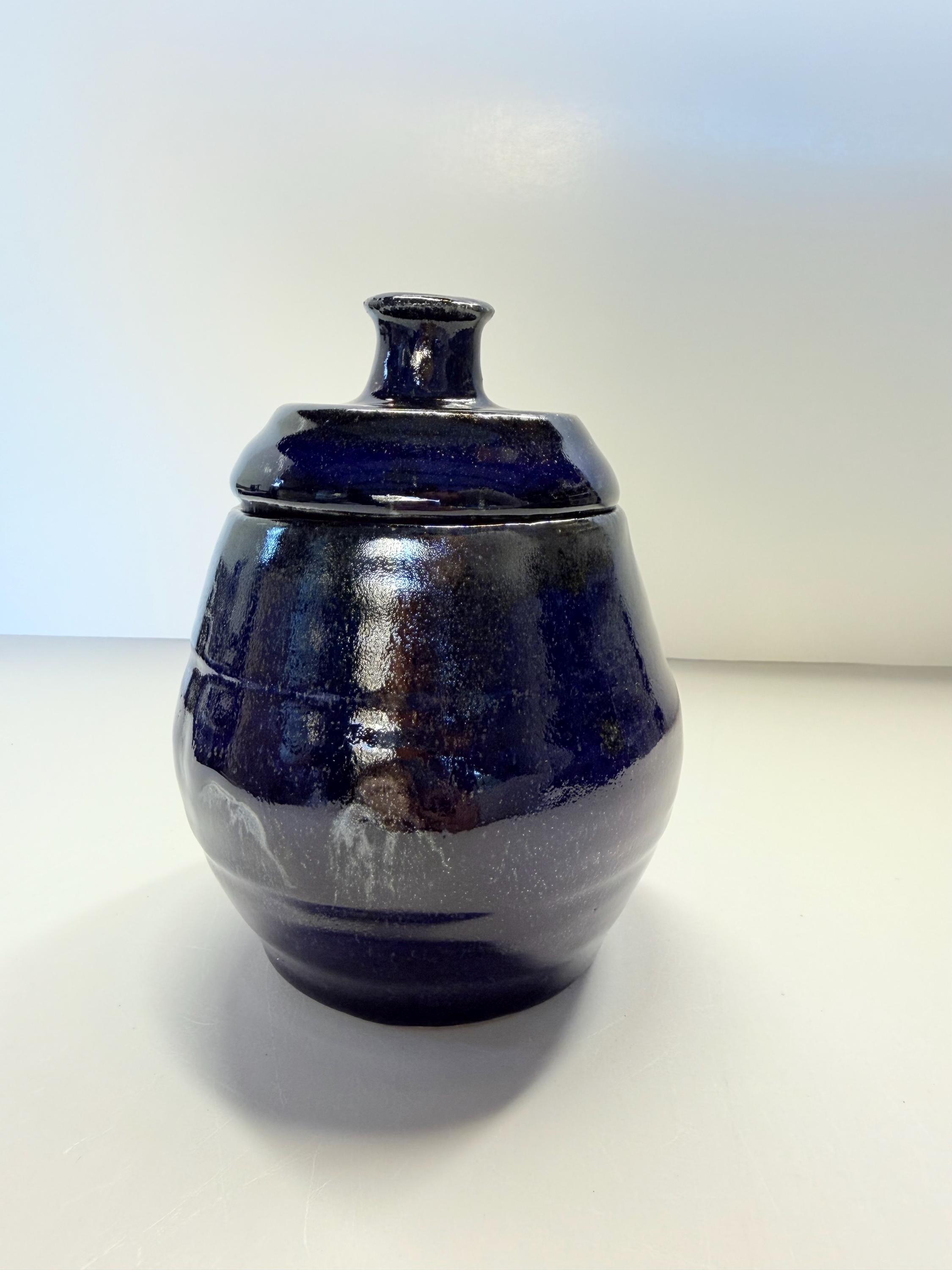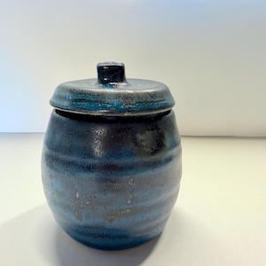 This form is a jar with a lid. I used a bright blue glaze over a black glaze. It turned out beautifully and in the sun it has an iridescent sheen. I would use this as a salt cellar, or sugar bowl/jar or, bath storage for cotton balls. Again, it's up to you how you use it! As with all my pottery, it is one of a kind. I can make another one in a different color, but i can't always guarantee how the glaze and clay will work and play together. So, if you like this one, i would encourage you to order it.