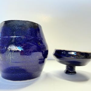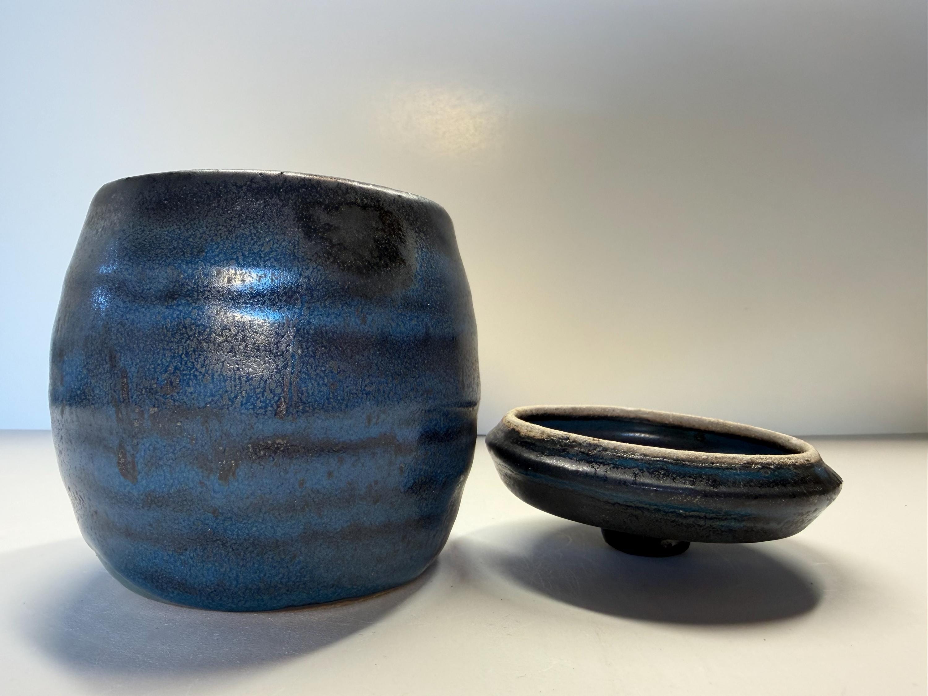 This form is a jar with a lid. I used a light blue glaze over a black glaze which creates a mottled effect. I would use this as a salt cellar, or sugar bowl/jar/bathroom storage for qtips and cotton. Also, it would work for a larger candle holder. Again, it's up to you how you use it! As with all my pottery, it is one of a kind. I can make another one in a different color, but i can't always guarantee how the glaze and clay will work and play together. So, if you like this one, i would encourage you to order it.