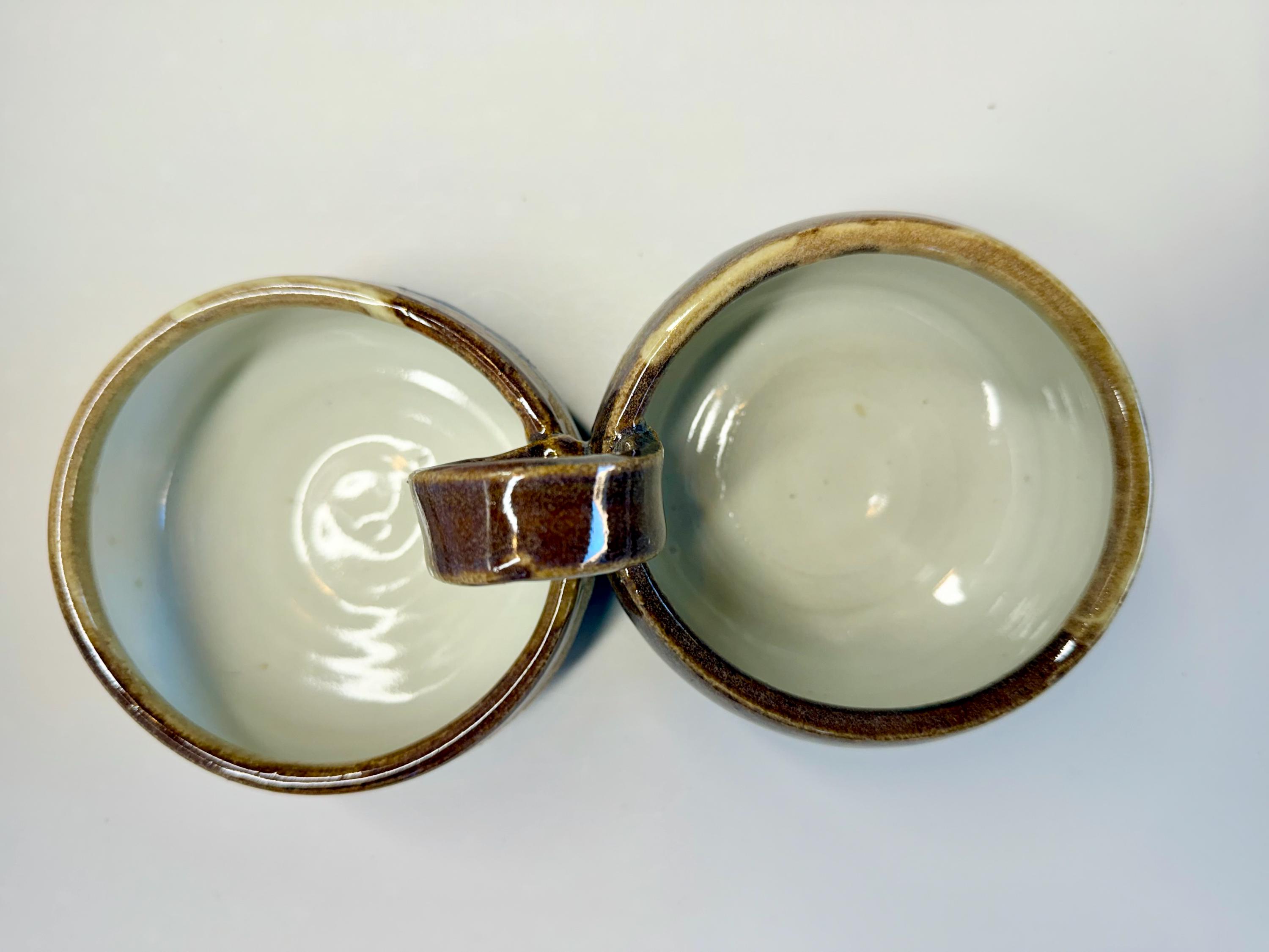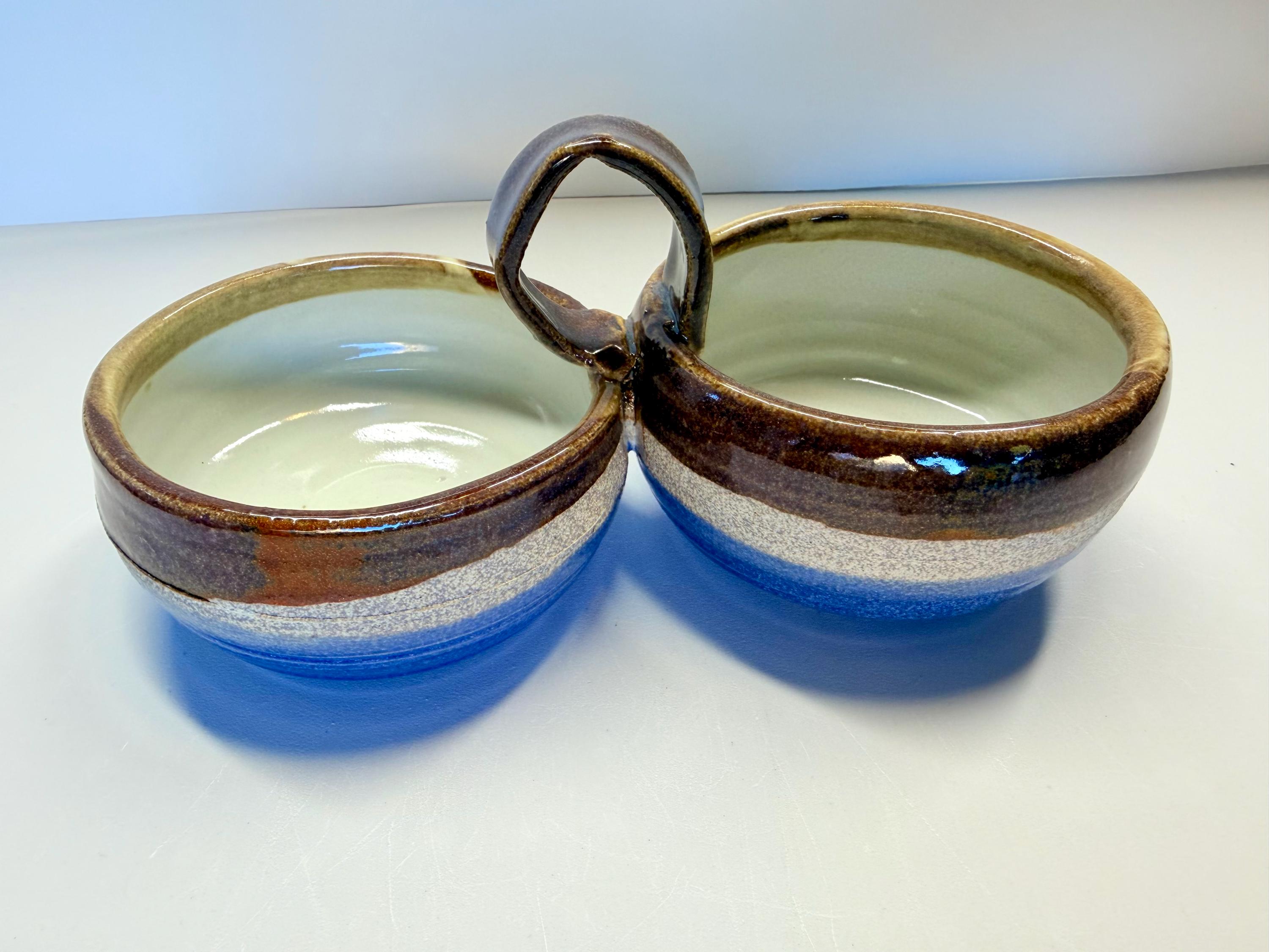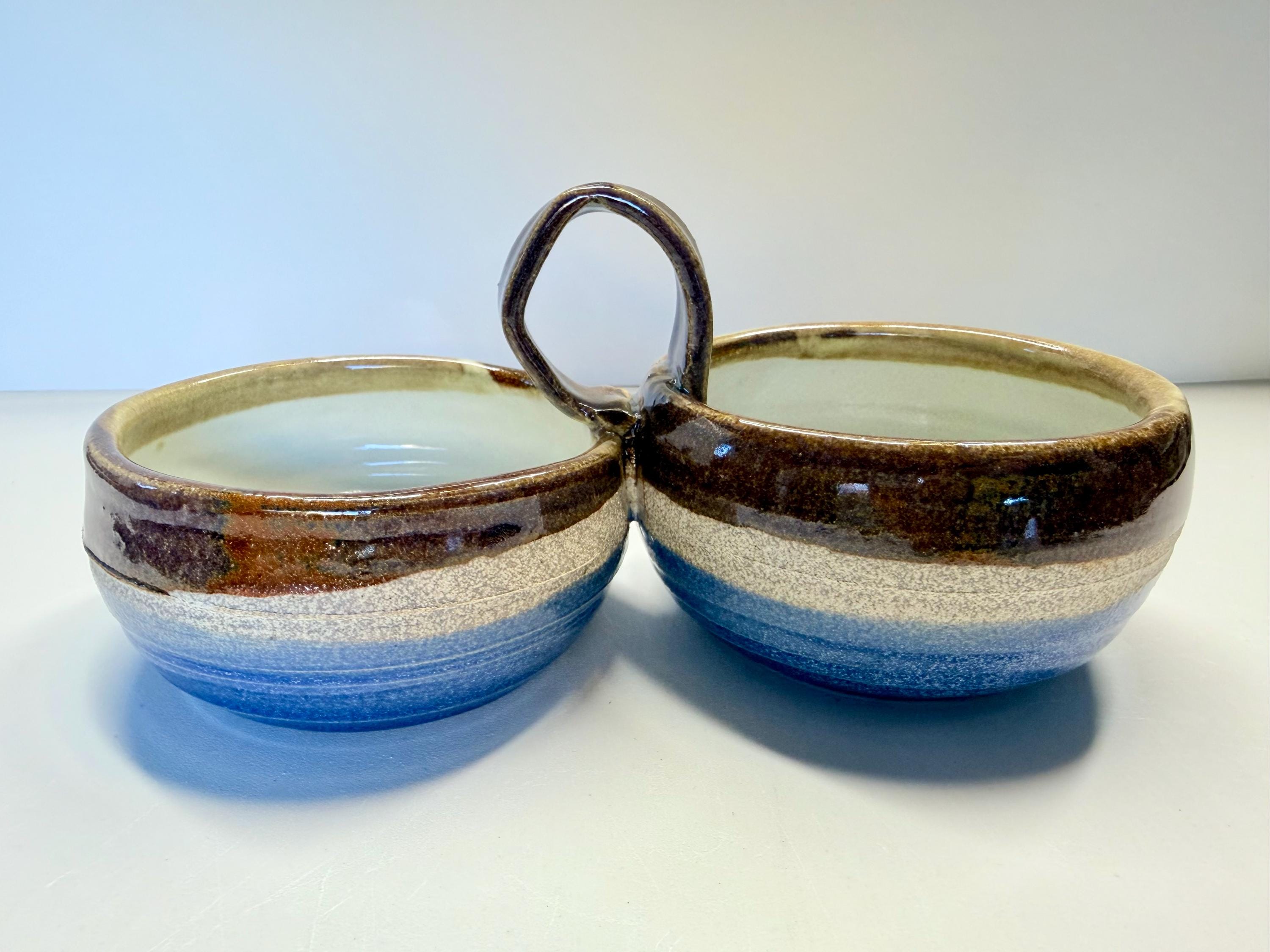This is a new form I have been playing with since last Summer. It would work for any type of sauce or dip…why choose between red or green sauce when you can have both! I threw a white clay and glazed this one with brown on top and blue on the bottom. I let some of the natural clay show between the 2 colors. And, as with all my pottery, it's one of a kind. So, if you like it, order it! I can make more, but I can’t guarantee how the glaze and clay will play together.