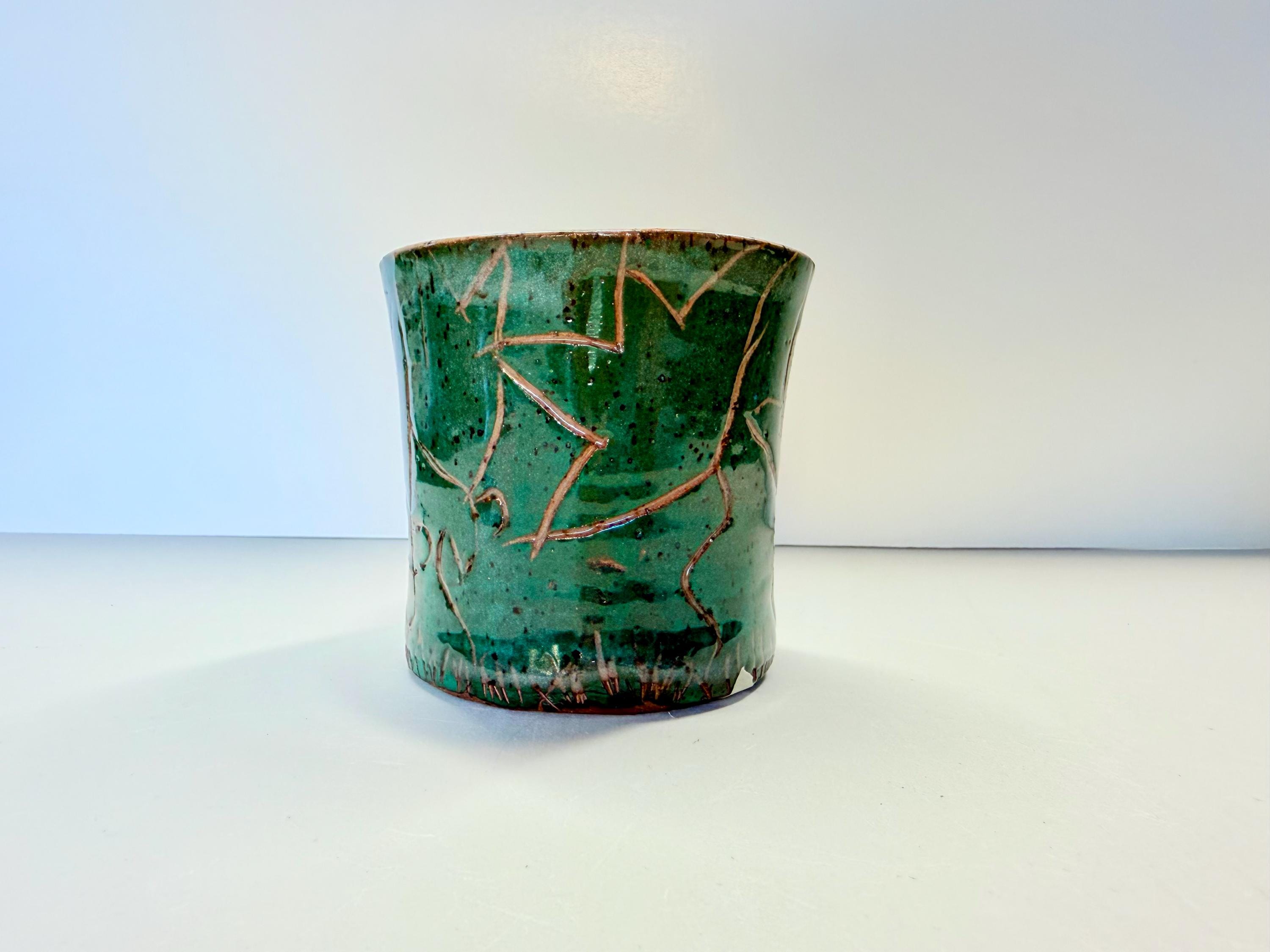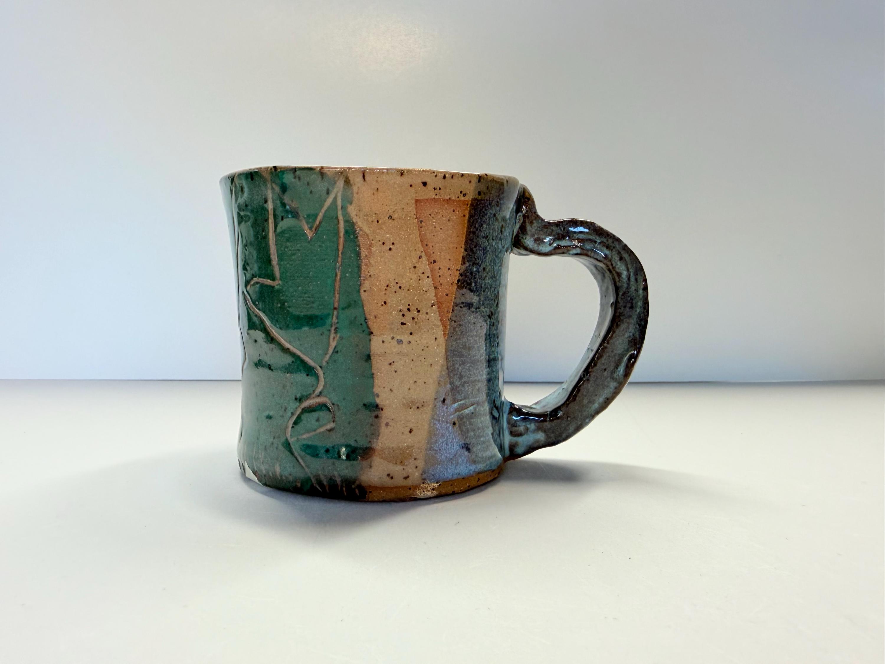 A mug with multi-colored background and scraffito carvings of abstract flowers on the exterior. Who doesn't love a mug in the Winter...or, anytime you want a calming cup of tea. I made sure this was a good-sized mug with a nice heavy handle for anyone to use. And, with all my pottery, it's one of a kind, so if you like it, order it soon.