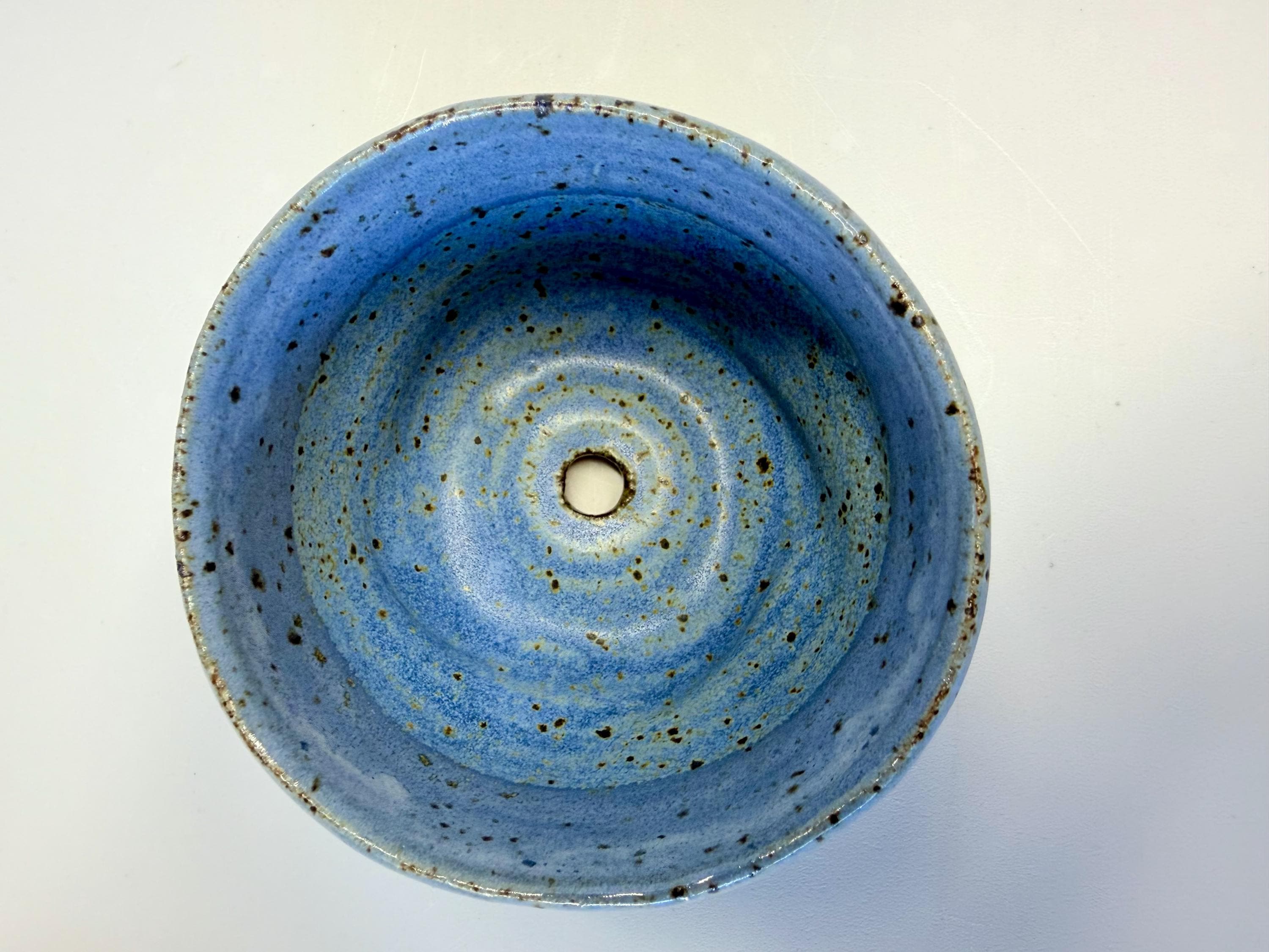 Small succulent or herb planter will hold all sorts of smaller plantings. This could be used inside your home or in a window box inside or outside..wherever it works best in your garden. It's a refreshing light blue glaze over a clay that shows the iron ore through the glaze. I would call this style rustic or bohemian. And, does have a hole for draining water.